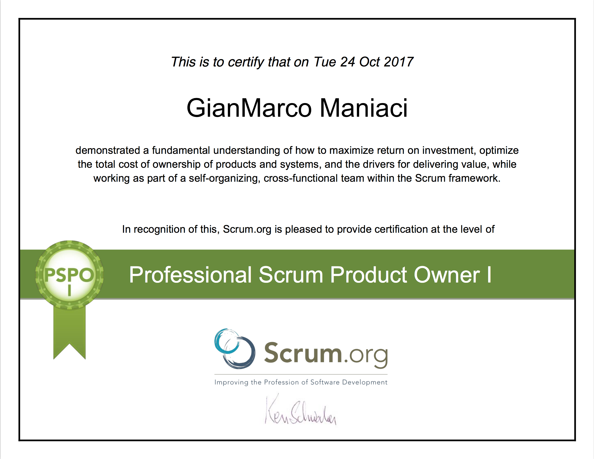 People that have passed PSPO I and achieved certification demonstrate an intermediate understanding of the Scrum framework, and how to apply it to maximize the value delivered with a product. They exhibit a dedication to continued professional development, and a high level of commitment to their field of practice. Achieving PSPO I is the minimum demonstration of knowledge any Professional Scrum Product Owner should be able to make.